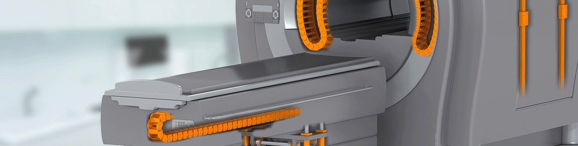 Medical surroundings require components that fulfil the highest hygiene standards. Lubrication-free and corrosion-resistant plain bearings and energy supplies made of a special plastic are the right choice here. Plastic bearings are used in X-ray robots, laboratory devices, patient and treatment chairs, hospital beds and prostheses. Maintenance-free energy chains are used for the protection and guidance of cables, e.g. in operating theatre devices, rehabilitation systems and imaging diagnostic equipment. Our components are cleanroom-compatible, media-resistant and quiet - for the highest medical requirements.